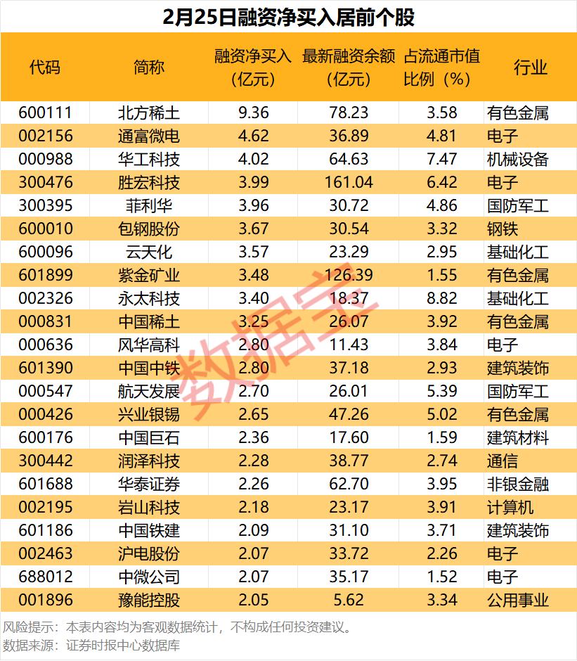 具体到个股,2月25日共有2164只股获融资净买入,净买入金额在千万元以上的有680只,其中76只融资净买入额超1亿元。朔方稀土融资净买入额居首,当日净买入9.36亿元;其次是通富微电、华工科技,融资净买入金额折柳为4.62亿元、4.02亿元,融资净买入金额居前的还有胜宏科技、菲利华、包钢股份等。